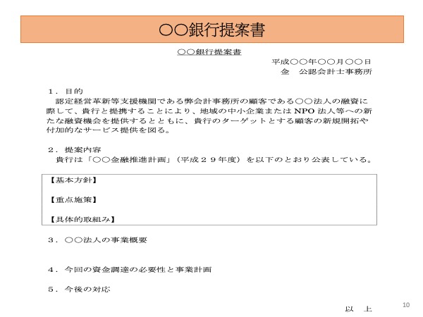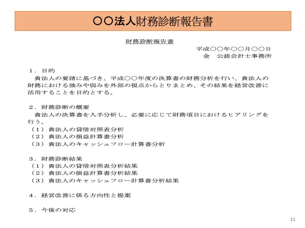 ・決算書を財務分析し、どこに問題があり、その問題に対してどのように改善するかについてヒアリングを行い、解決の方向性を提案する。