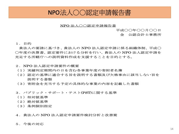・NPO法人の設立、認定・特例認定申請に際して、所轄庁への説明資料作成支援を行う。
