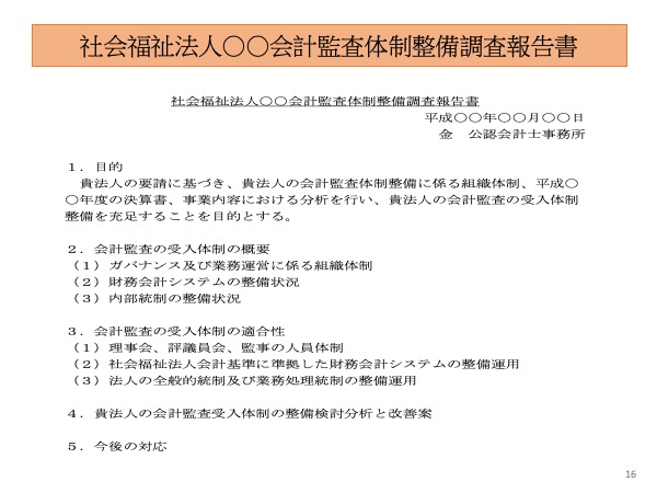 ・社会福祉法人の会計監査受入体制整備または経営改善に際し、業務フローや関連規程等の作成、所轄庁との協議の同行支援を行う。