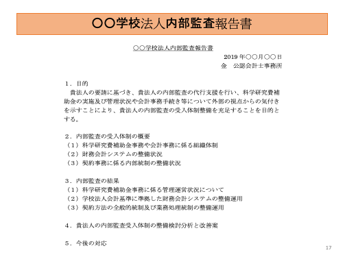 ・学校法人の内部監査受入体制整備または経営改善に際し、業務フローや関連規程等の作成支援を行う。