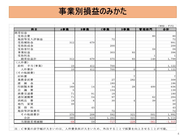 ・事業別損益の把握の仕方を理解してもらい、法人の強みや弱みを分析したうえで、経営改善の気付きをアドバイスする。