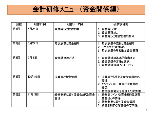・経営者及び幹部職員には、経営に役立つ会計情報の見方や活用の研修、実務担当者には、会計の基礎や決算書作成に役立つ会計研修を行う。