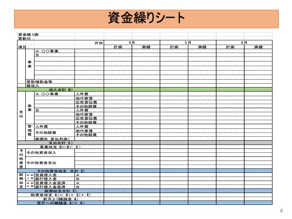 ・資金繰りシートや資金収支計算書シートを提供し、資金収支の見込みや資金対応をアドバイスする。